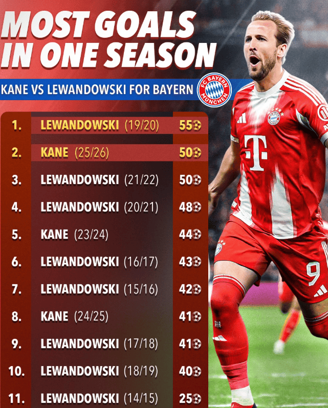 凯恩目前的数据已经逼近拜仁传奇赛季纪录。他距离罗伯特·莱万多夫斯基在2019/20赛季创造的47场55球纪录仅差5球,这一纪录被视为拜仁近年最具代表性的进攻标杆。本赛季凯恩仍有充足比赛机会继续冲击这一历史级数据,并有望完成超越性突破。